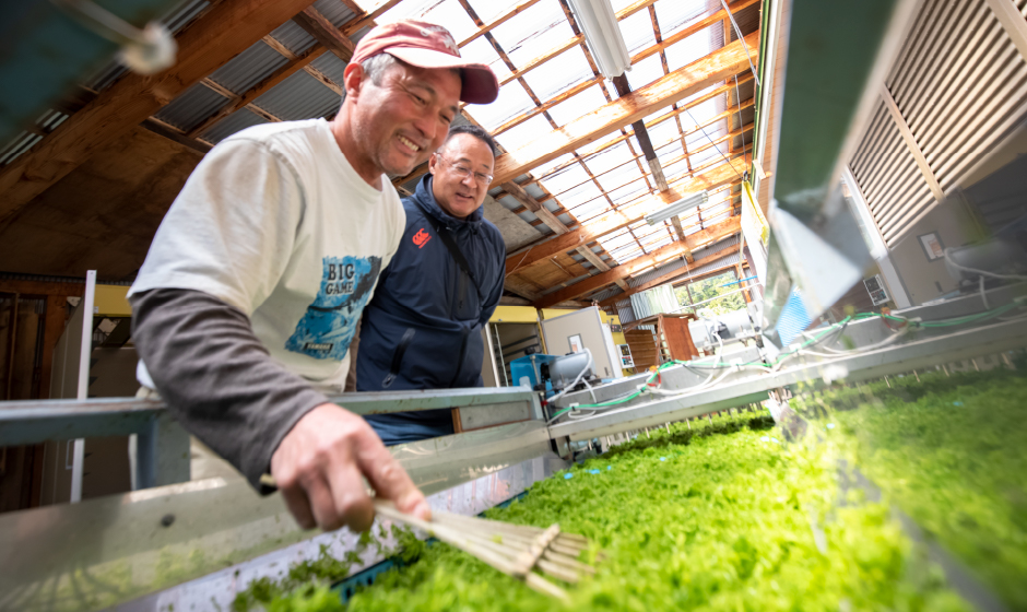 収穫した海苔は船で桟橋の処理小屋へ運び、網から外し、葉洗いへと作業を進める。ゴミや異物の混入は海苔にとって死活問題。「それは生産者だけの責任じゃない。私たちの責任でもある。だから生産者や加工業者、問屋と一緒に、チームとして対策を考えるんです」と森田。品質を上げればロスが増える。生産者は苦しい。それをどうベストバランスにするか。だからこそ、しっかり付き合ってお互いに横の関係で信頼を築き、レベルを上げることをめざすことが大切だと言う。松村さんが特注で制作した葉洗い機が勢いよく回り出す。海水の濁りが取れていき、海苔が見る見る鮮やかな緑に輝きだした。